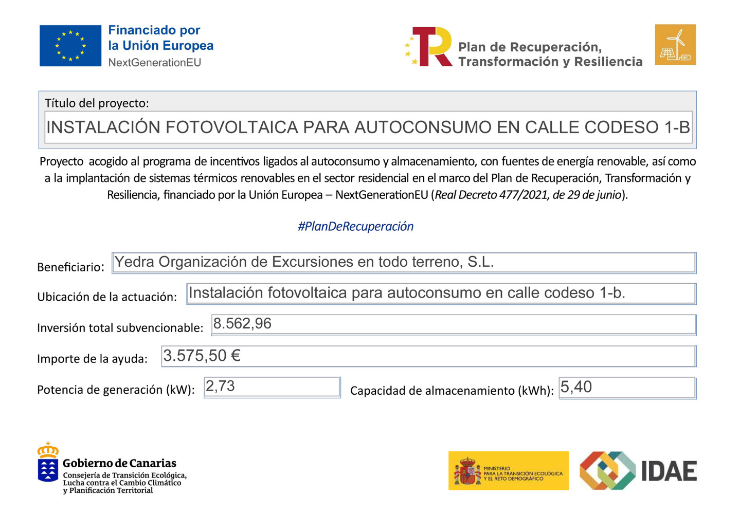 Project included in the programme for incentives linked to self-consumption and storage with renewable energy sources, as well as the implementation of renewable thermal systems in the residential sector, within the framework of the Plan for Recovery, Transformation and Resilience, funded by the European Union - NextGenerationEU